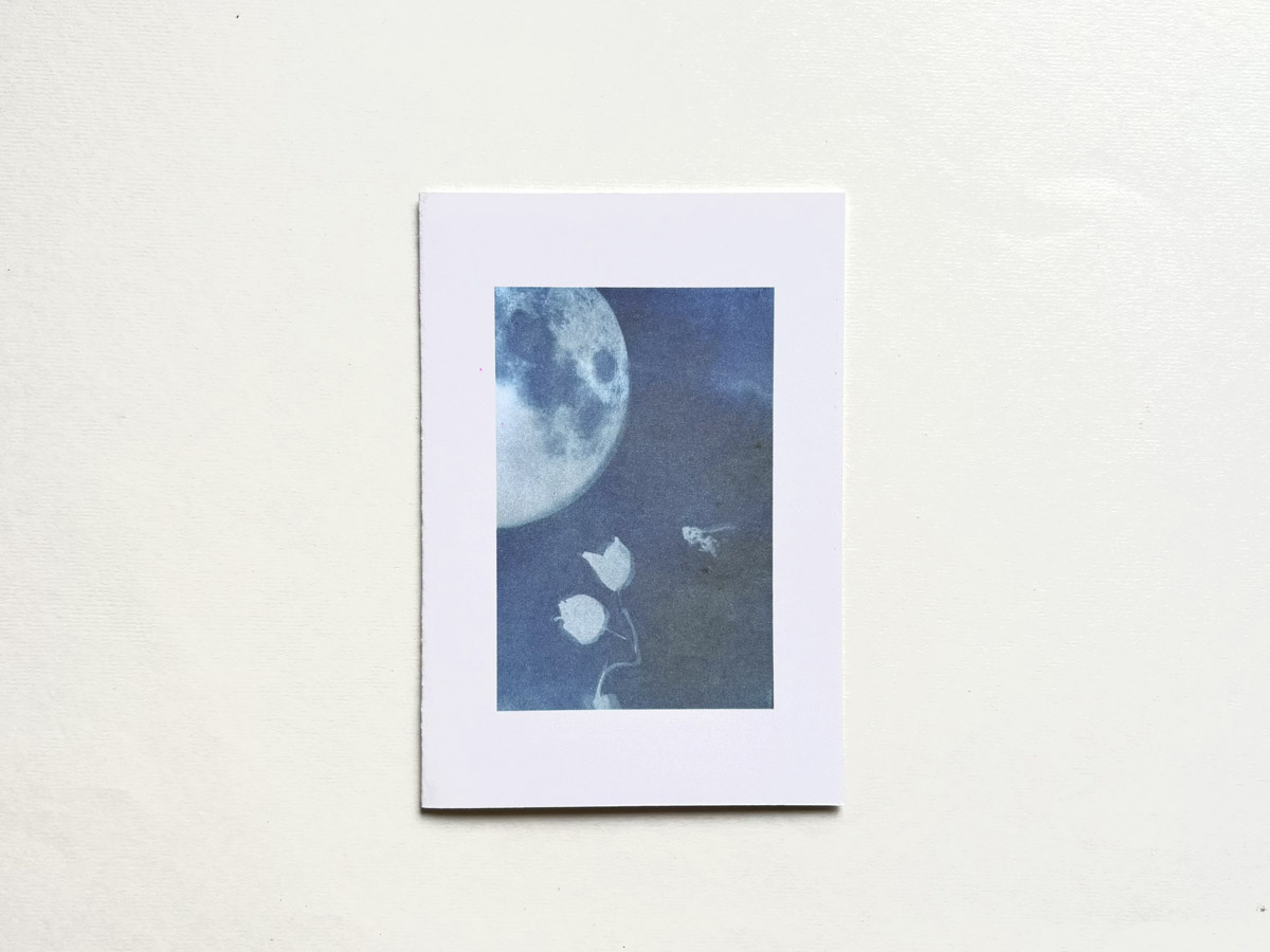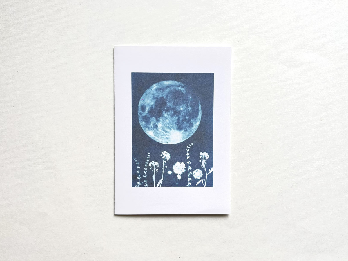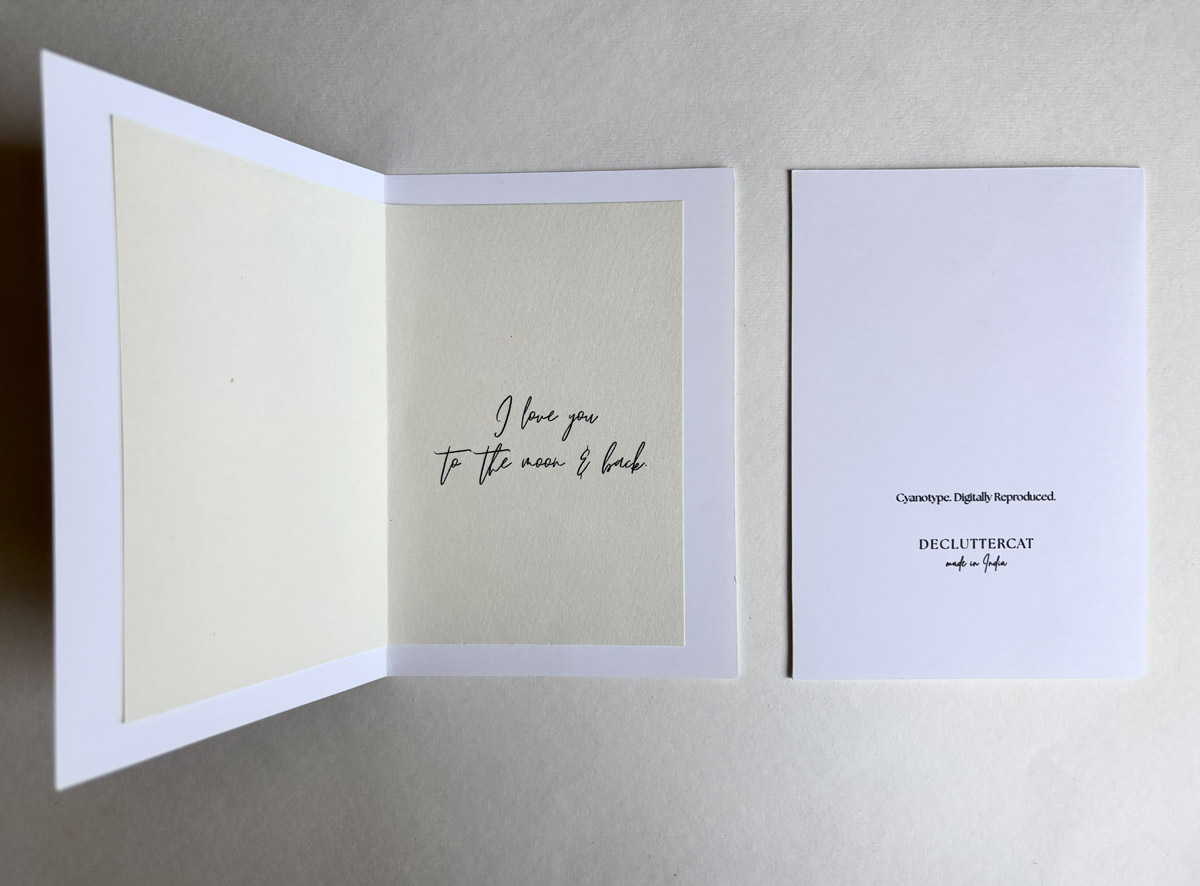 Digital copies of original cyanotype prints, designed as small love greeting cards. Featuring the moon and pressed flowers, each piece carries the calm, blue stillness of a sun-printed process — cyanotype.